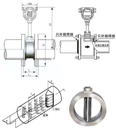 涡街流量计在流体中设置三角柱型旋涡发生体,则从旋涡发生体两侧交替地产生有规则的旋涡,这种旋涡称为卡门旋涡,如右图所示,旋涡列在旋涡发生体下游非对称地排列。