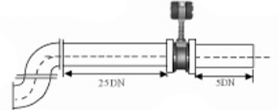 5.不同平面两个弯管的安装 如果流量计的前端有两个90°弯头,要保证流量计的前直管段≥25D,后直管段≥5D |