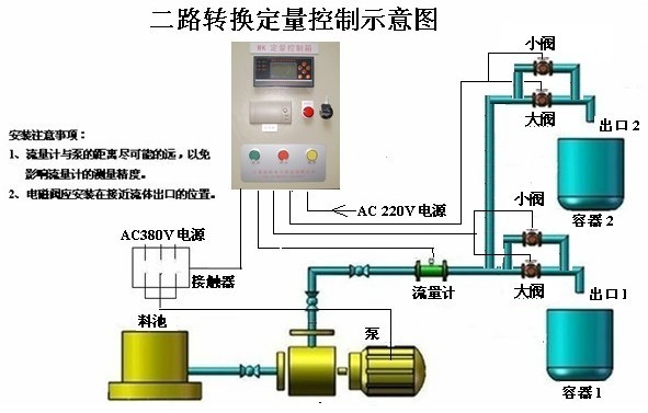 控制仪输入为4-20mA或脉冲信号,带外接启动、停止、清零,两个继电器输出。继电器到电磁阀需加一个中间继电器,如果电磁阀是24V供电,需增加一个24V开关电源。 注:指示灯、按钮、中间继电器、空气开关、交流接触器(可省)、定量控制仪(液晶显示)、控制箱、组成一个控制系统,控制现场(24VDC)电磁阀启动或停止,另要加一个总电源开关、流量计,电磁阀,需要按照现场要求来做。(配件可以用户自己配)