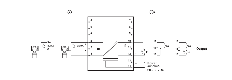 1、工作电源:电源接线:独立的接线端子13-,14+,可带电拔插